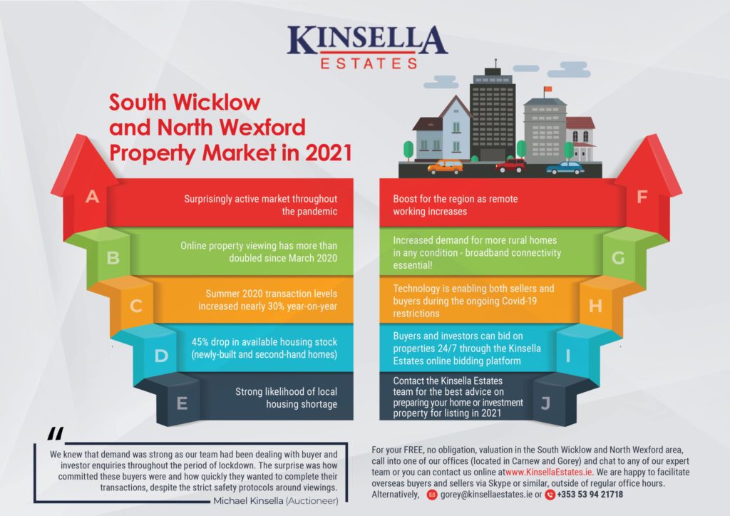 For your FREE, no obligation, valuation in the South Wicklow and North Wexford area, call into one of our offices (located in Carnew and Gorey) and chat to any of our expert team or you can contact us online atwww.KinsellaEstates.ie. We are happy to facilitate overseas buyers and sellers via Skype or similar, outside of regular office hours. Alternatively, email gorey@kinsellaestates.ie or telephone: +353 53 94 21718